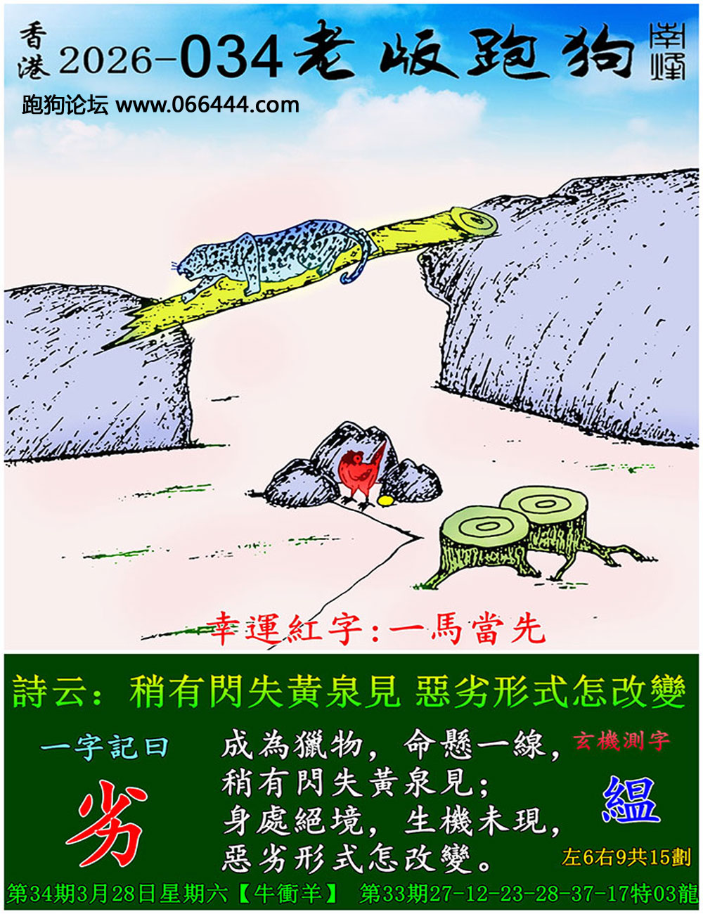 034期老版跑狗一字記之曰:【劣】 詩雲:稍有閃失黄泉見,惡劣形勢怎改變。 成為獵物,命懸一線,稍有閃失黄泉見; 身處絕境,生機未現,惡劣形勢怎改變。 玄機測字:《緼》