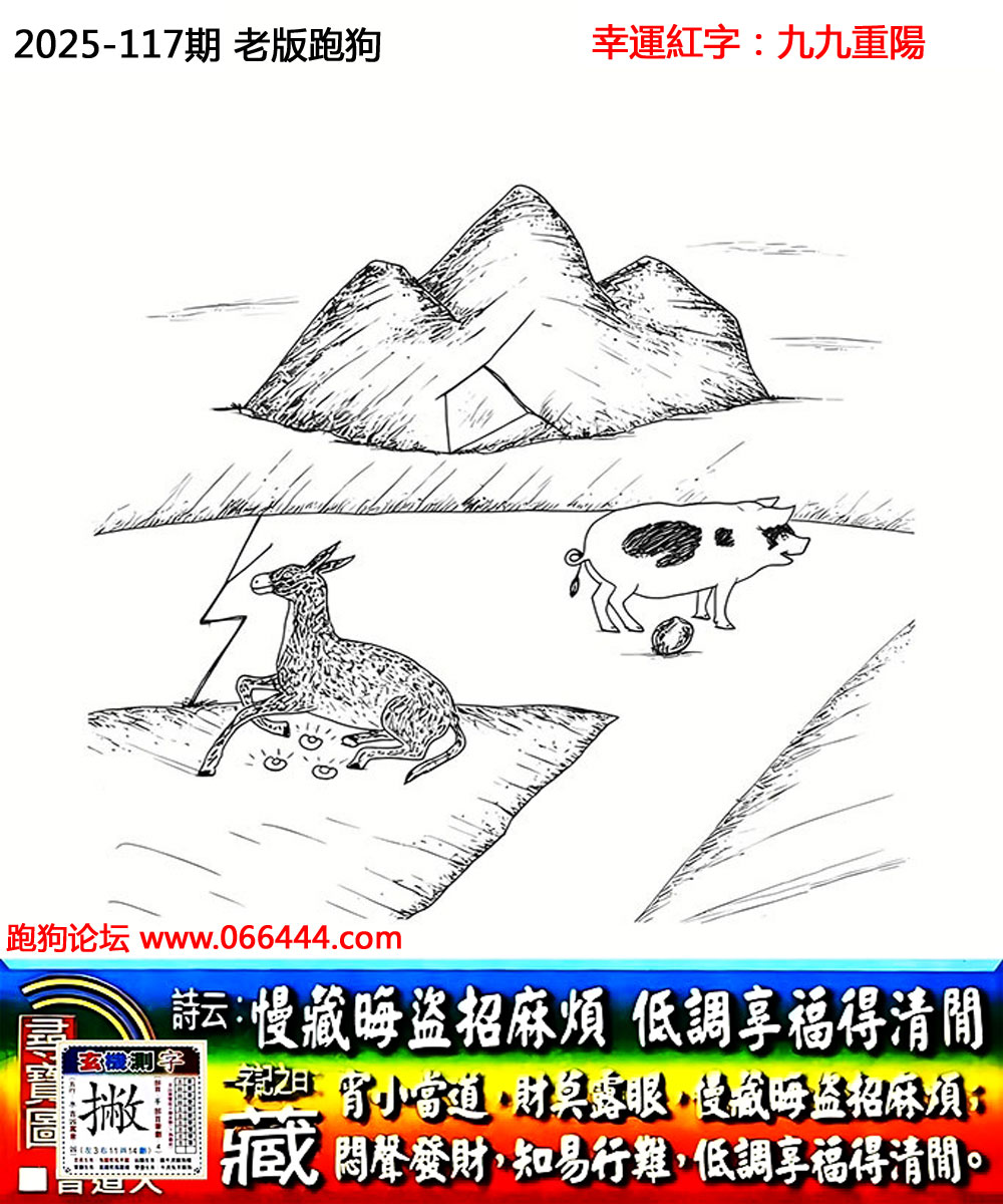 117期老版跑狗一字記之曰:【藏】 詩雲:慢藏晦盜招麻煩,低調享福得清閒。 宵小當道,財莫露眼,慢藏晦盜招麻煩; 悶聲發財,知易行難,低調享福得清閒。 玄機測字:《撇》